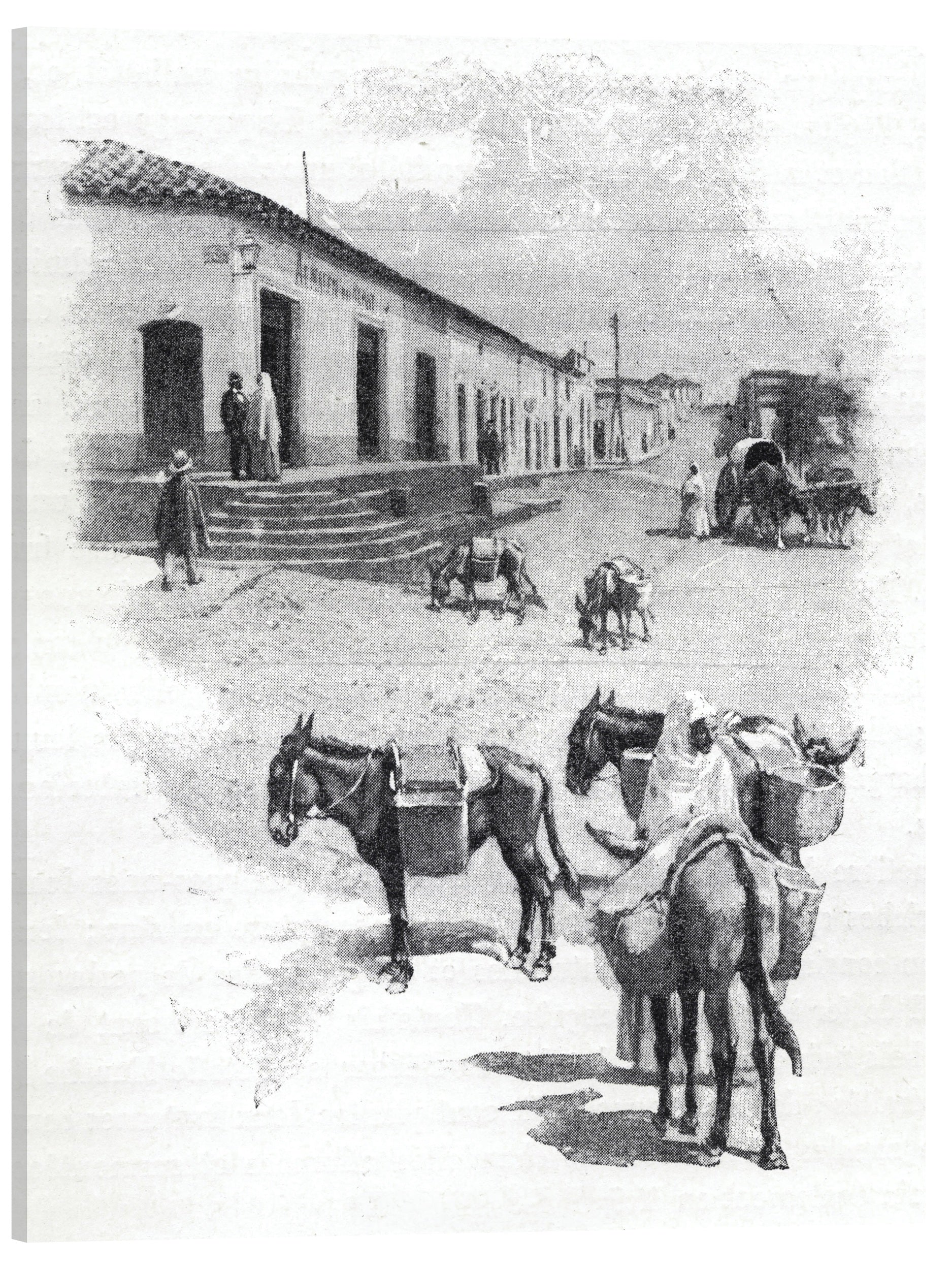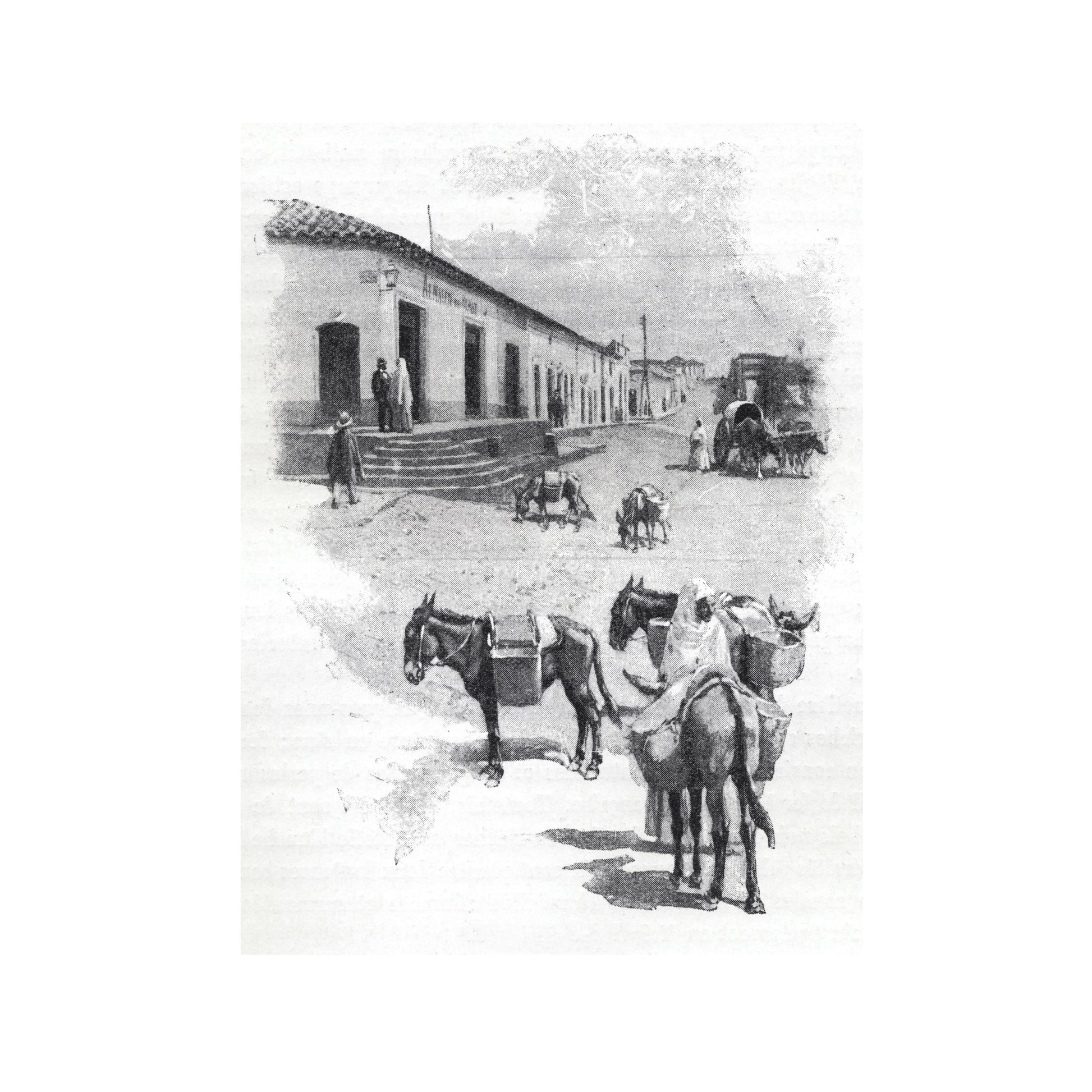 Grabado histórico atribuido a Édouard Riou, que retrata una calle colonial de Asunción con arrieros y burros de carga. La escena documenta la logística cotidiana de la ciudad en el siglo XIX: casas de teja y muros encalados, carretas y el tránsito de mercancías.