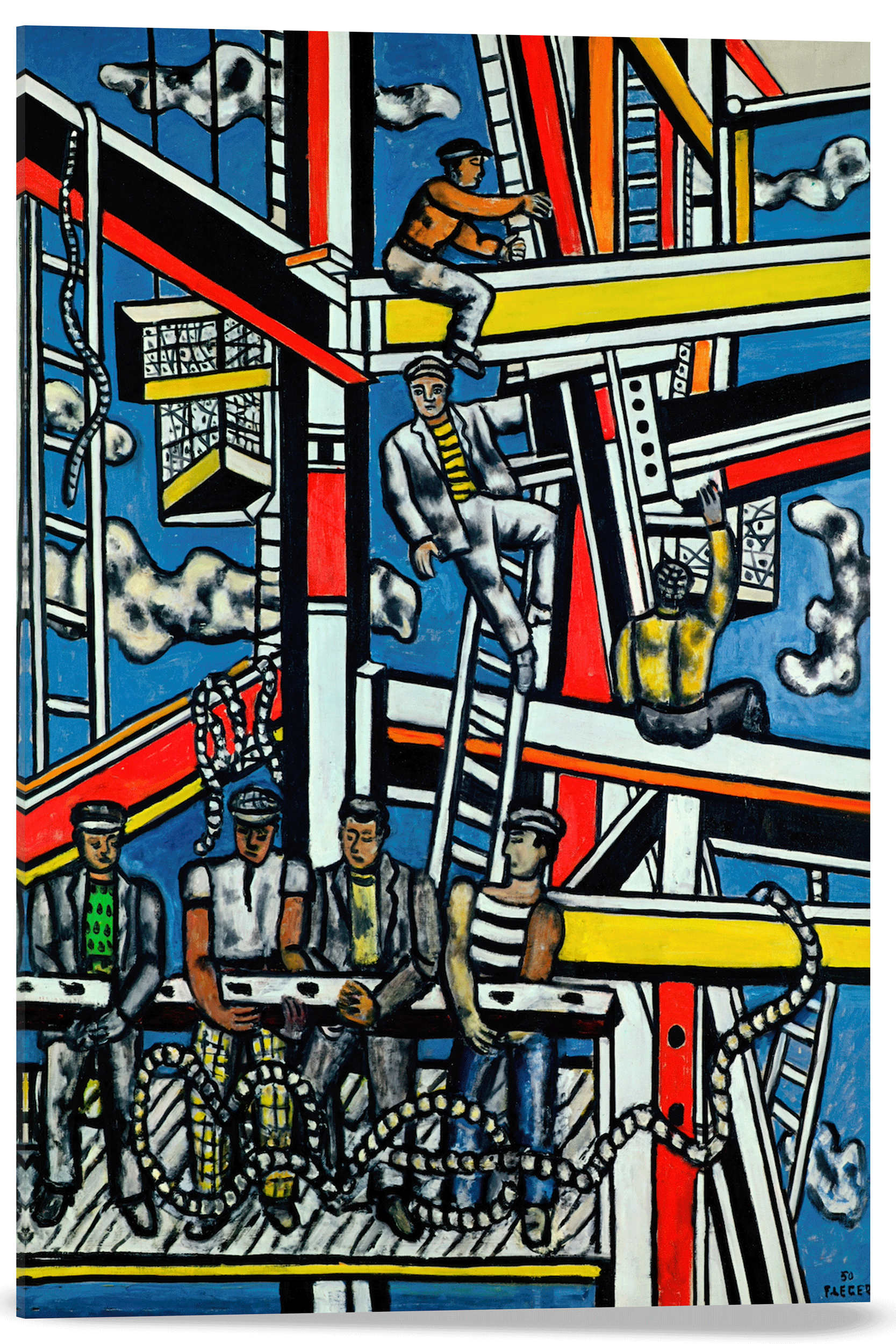 Constructores con cuerda (1950) es una pieza emblemática de la serie de Fernand Léger dedicada a la clase trabajadora y la reconstrucción de posguerra. A través de su característico estilo "tubismo", el artista francés combina figuras humanas con estructuras industriales, utilizando líneas negras gruesas y colores primarios puros para celebrar la fuerza y el optimismo del progreso moderno.