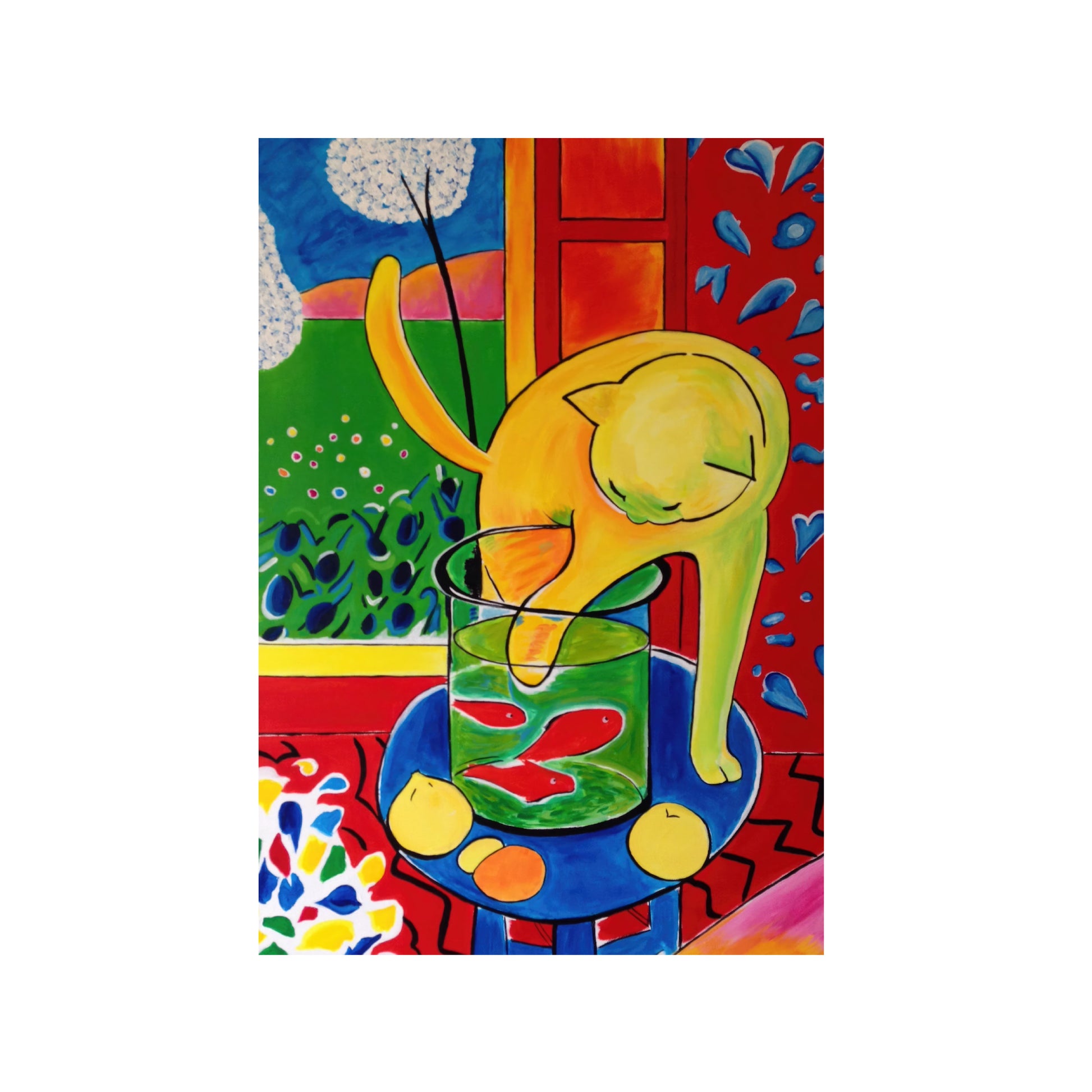 La pintura captura una escena cotidiana en la que un gato amarillo se inclina con curiosidad sobre un recipiente de vidrio donde nadan varios peces rojos. La composición es dinámica y juega con la perspectiva, integrando elementos domésticos como una mesa azul con limones y un fondo decorativo que evoca un jardín a través de una ventana. En conjunto, la obra destila una atmósfera de paz y quietud, simbolizando la conexión instintiva entre el arte, la naturaleza y la vida diaria.