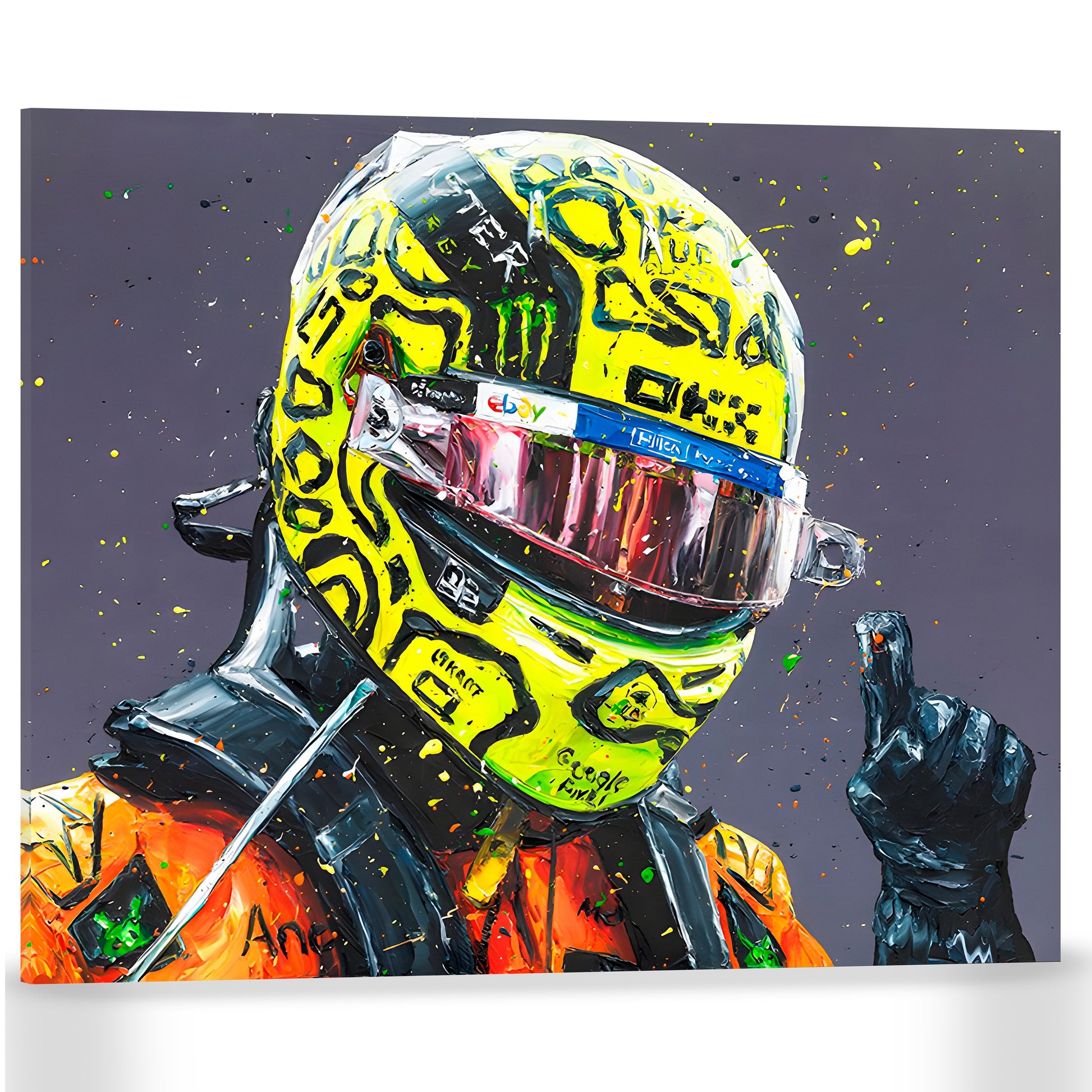 En esta pieza, Oz captura con maestría la emoción, la euforia y el momento decisivo en que Lando Norris celebra su primera victoria en la pista, inmortalizado con su estilo explosivo y lleno de textura.