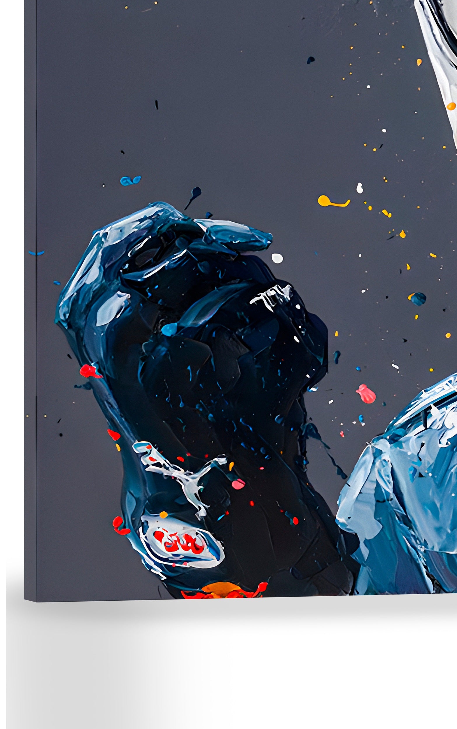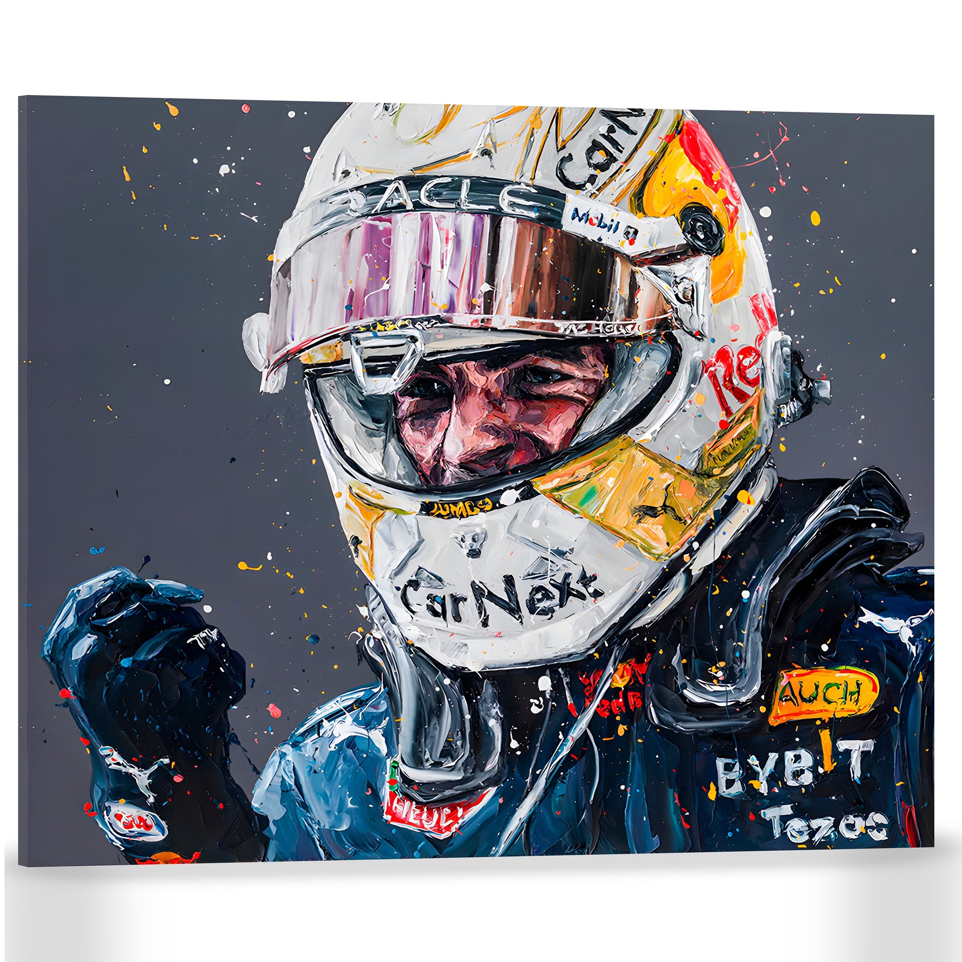 En esta obra se retrata al campeón del mundo Max Verstappen durante la temporada 2022 de Fórmula 1, capturando el instante de euforia tras una de sus victorias más memorables, cuando consolidaba su dominio absoluto con el equipo Red Bull Racing.