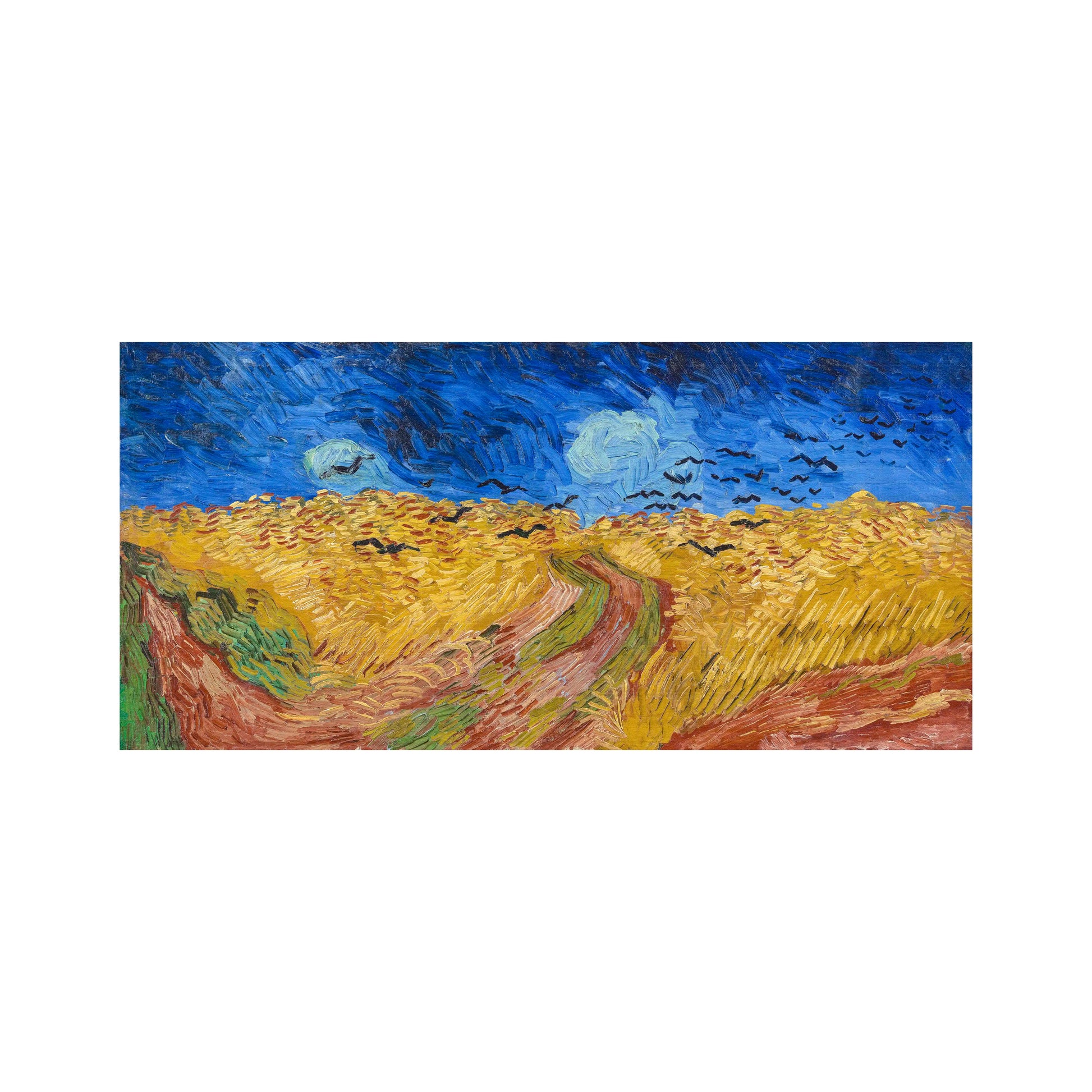 La obra representa un cielo dramático y nublado, lleno de cuervos sobre un campo de trigo. Una sensación de aislamiento se ve reforzada por un camino central que conduce a ninguna parte y por la dirección incierta del vuelo de los cuervos.