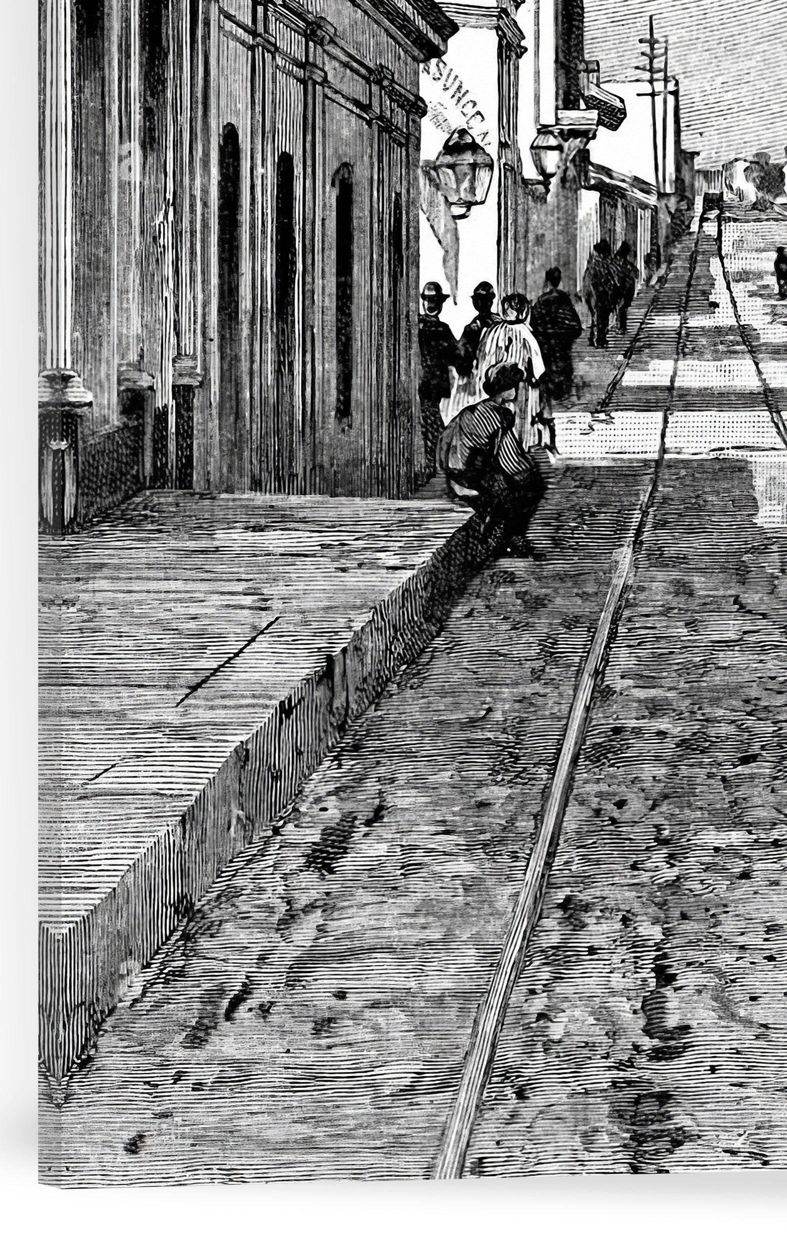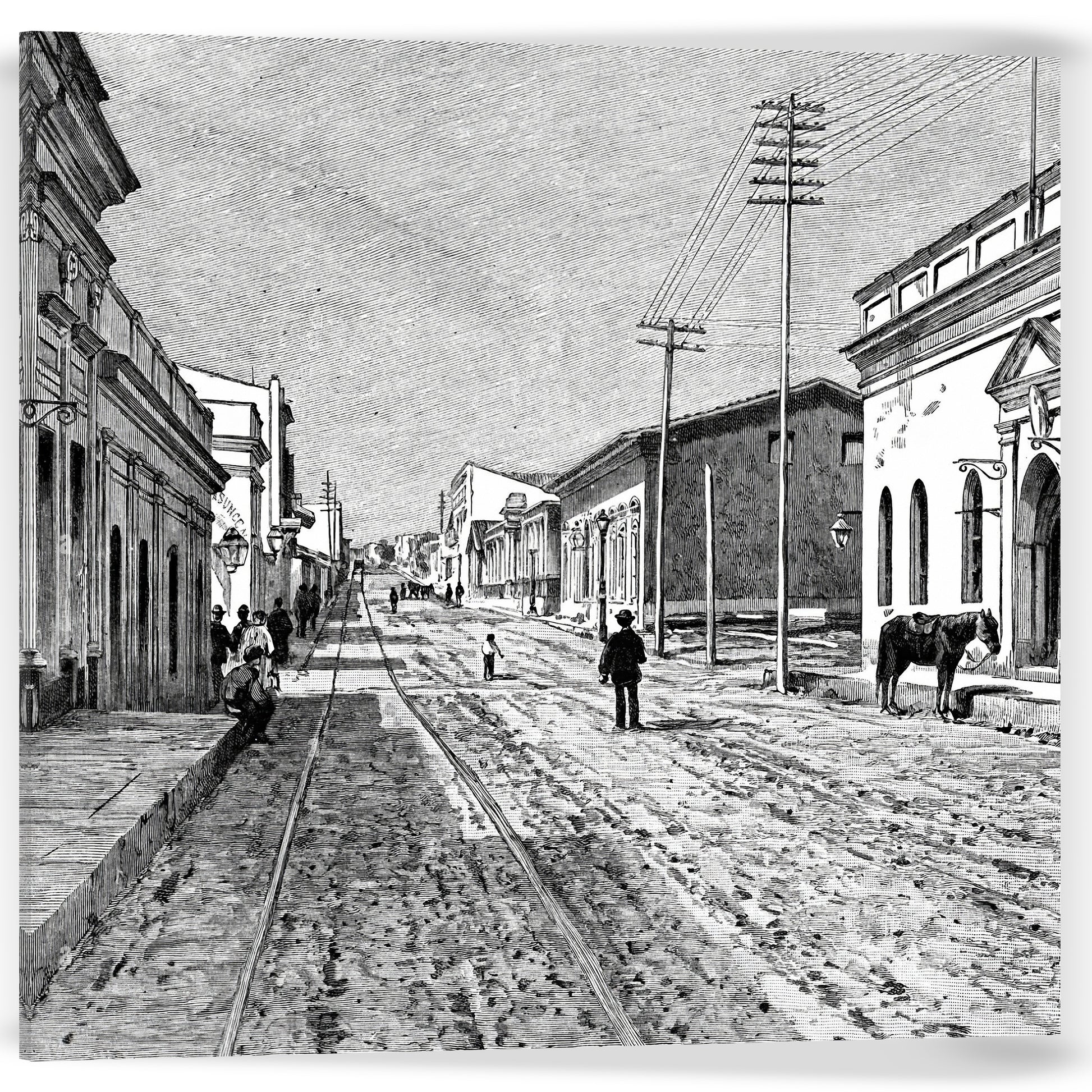 La escena representa una calle central de Asunción a fines del siglo XIX, cuando la ciudad se reconstruía tras la Guerra de la Triple Alianza. Se observan vías de tranvía a caballo, postes telegráficos y edificaciones de estilo neoclásico con muros de cal, techos de teja y veredas elevadas.